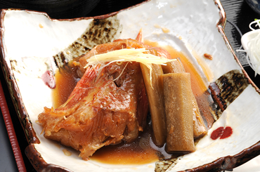かれい甘酢あんかけ・なまず、めかじきフライ・刺身・切干し大根・小松菜と油揚げ煮浸し・コンニャク田楽・お新香・ご飯・味噌汁