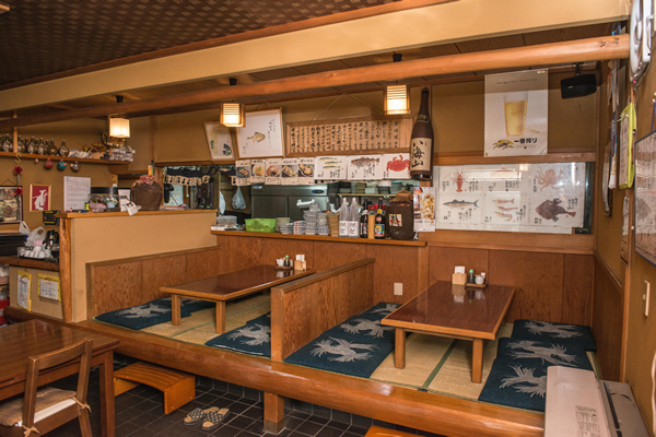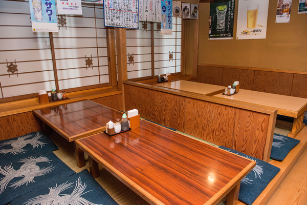 店内はテーブル席が4人掛け1つと2人掛け2つ、お座敷は店内入って正面と左手に分かれており、正面は4人席(最大6人)が2か所、左手は4人席が4つございます。